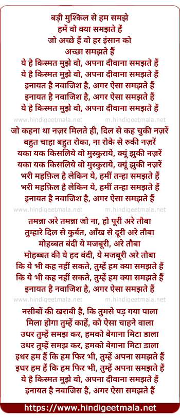 Lyrics of Badi Mushkil Se Hum Samjhe (Inayat Hai Nawajish Hai Agar Aisa Samajhte Hai) - बड़ी मुश्किल से हम समझे