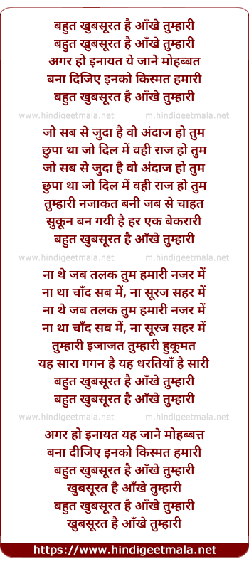 Lyrics of Bahot Khubsurat Hai Aankhe Tumhaari - बहुत खुबसूरत है आँखे तुम्हारी