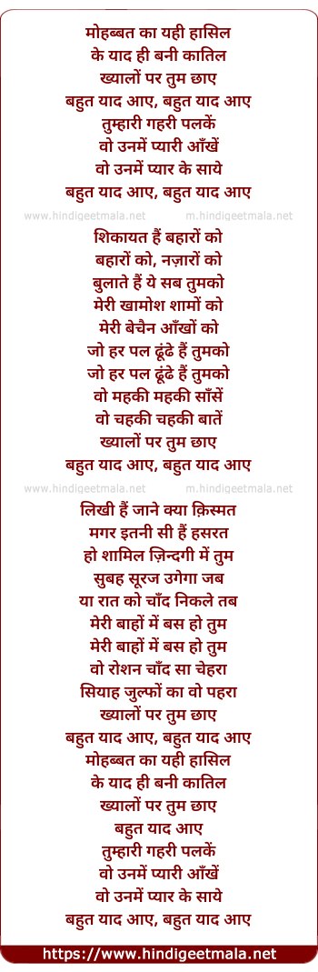 Lyrics of Bahut Yad Aaye - बहुत याद आए