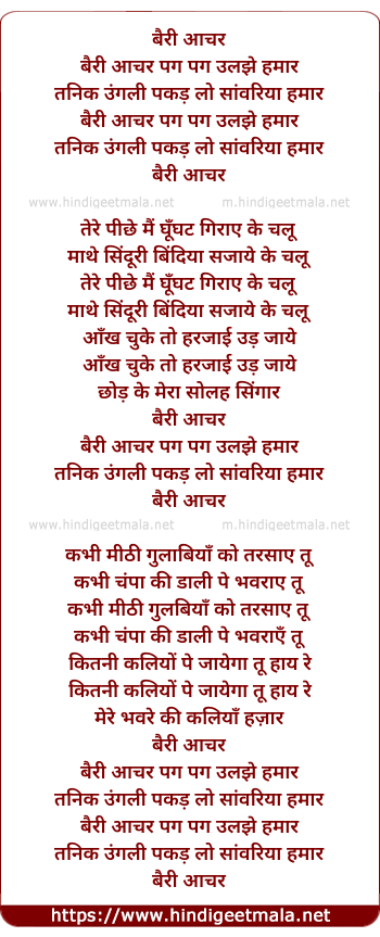 Lyrics of Bairi Anchar Pag Pag Uljhe - बैरी आचर पग पग उलझे