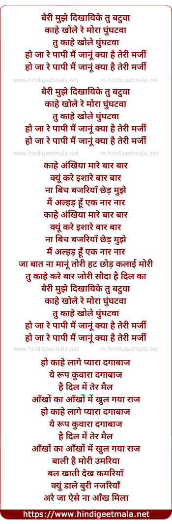 Lyrics of Bairi Mujhko Dikhaike Tu Batwa - बैरी मुझे दिखायिके तु बटुवा