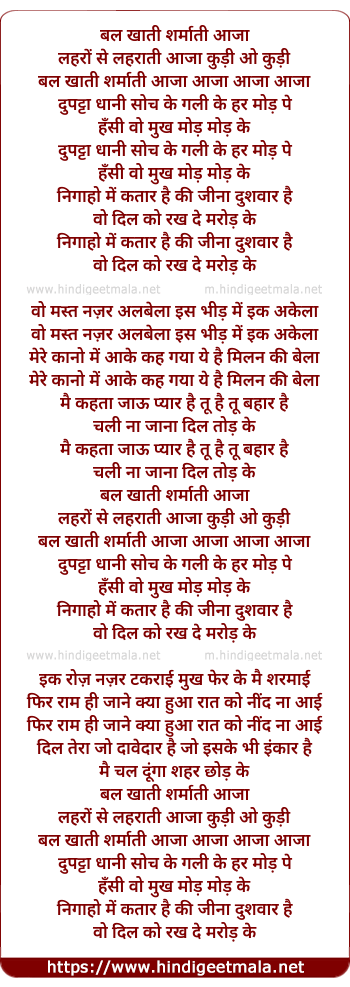Lyrics of Bal Khati Sharmati Aaja - बल खाती शर्माती आजा