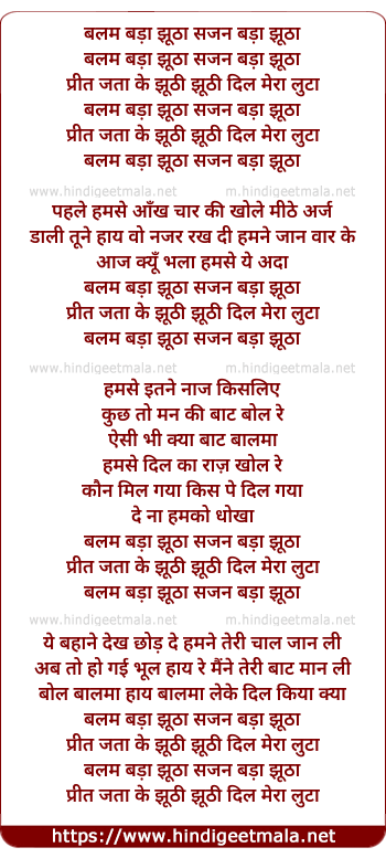 Lyrics of Balam Bada Jhutha, Sajan Bada Jhutha - बलम बड़ा झूठा, सजन बड़ा झूठा