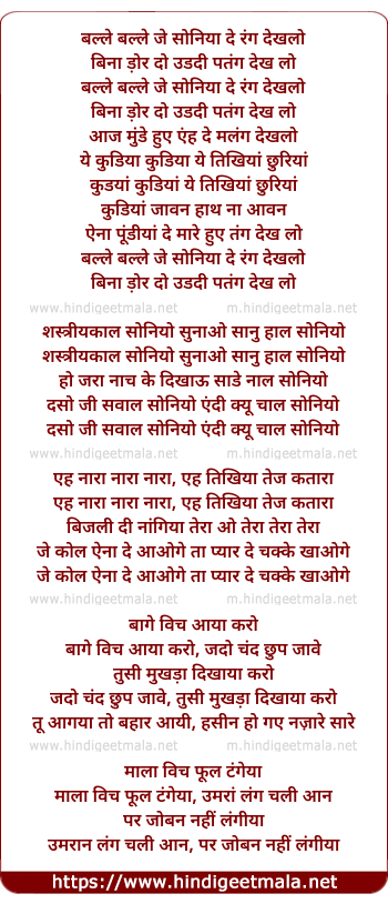 Lyrics of Balle Balle Je Soniya De Rang Dekhlo - बल्ले बल्ले जे सोनिया दे रंग देखलो