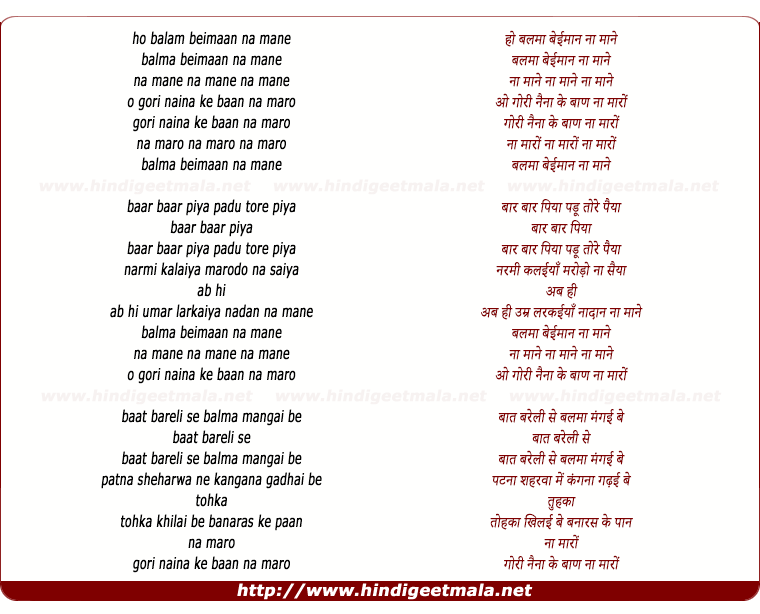 Lyrics of Balma Beiman Naa Mane - बलमा बेईमान ना माने