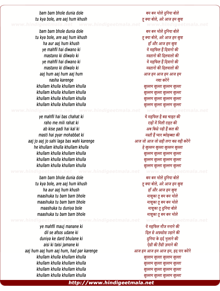 Lyrics of Bam Bam Bhole Duniya Dole (Khullam Khulla) - बम बम भोले दुनिया डोले (खुल्लम खुल्ला )