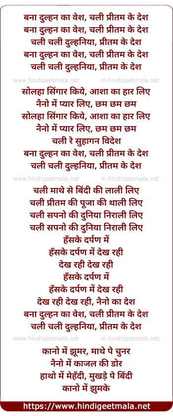 Lyrics of Bana Dulhan Ka Vesh Chali Pritam Ka Desh - बना दुल्हन का वेश, चली प्रीतम के देश