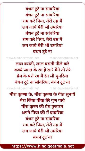 Lyrics of Bandhan Tute Na Saavariya - बंधन टूटे ना सांवरिया