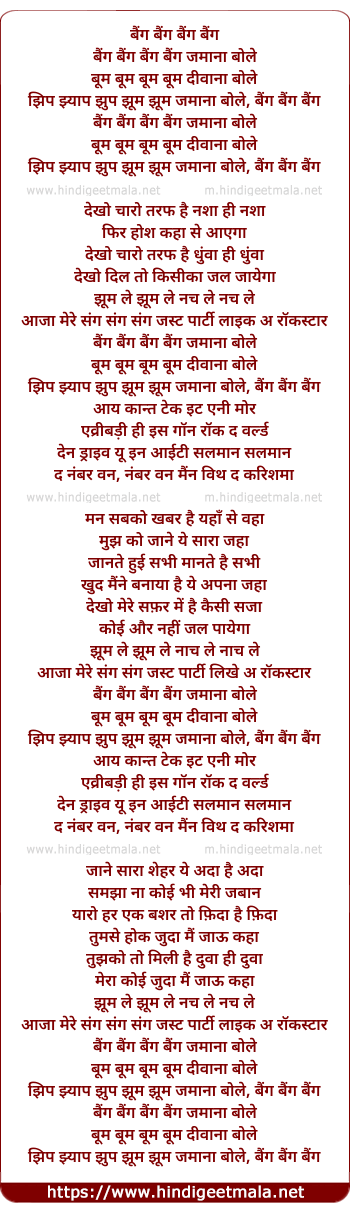 Lyrics of Bang Bang Bang Bang Jamana Bole - बैंग बैंग बैंग बैंग जमाना बोले