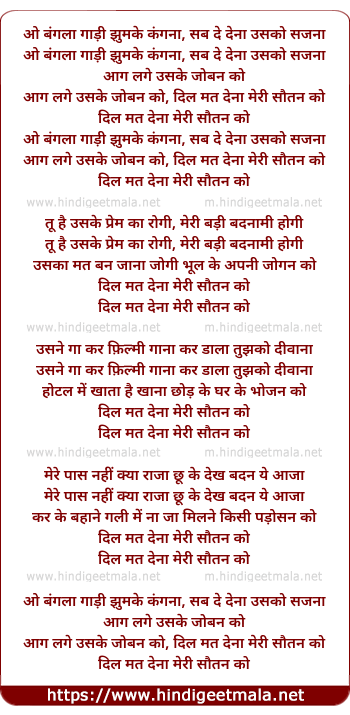 Lyrics of Bangalaa Gaadi, Dil Mat Denaa Meri Sautan Ko - बंगला गाड़ी, दिल मत देना मेरी सौतन को