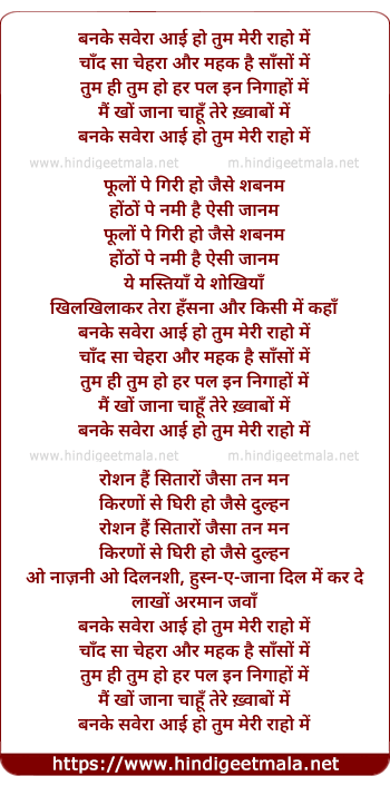 Lyrics of Banke Savera Aai Ho - बनके सवेरा आई हो तुम मेरी राहो में