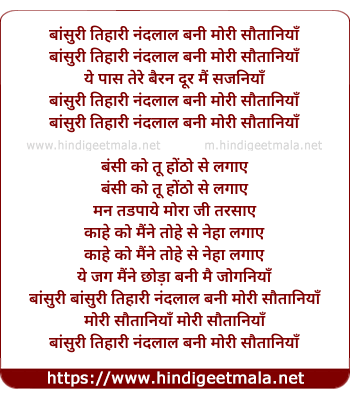 Lyrics of Bansuri Tihari Nandlal Bani Mori Sautaniya - बांसुरी तिहारी नंदलाल बनी मोरी सौतानियाँ