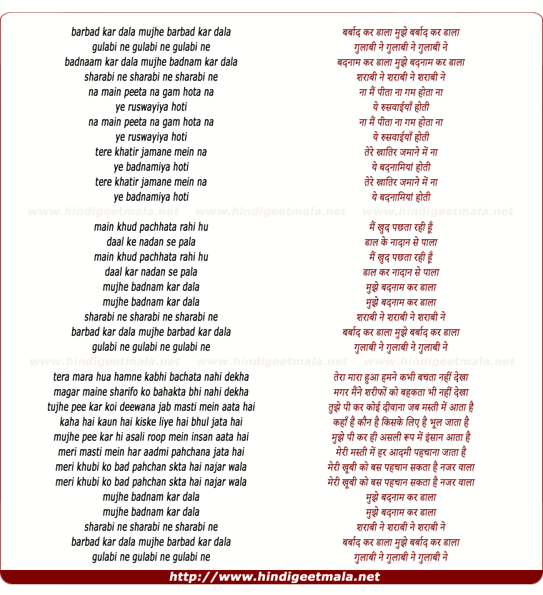 Lyrics of Barbad Kar Daala Mujhe Barbad - बर्बाद कर डाला मुझे बर्बाद कर डाला