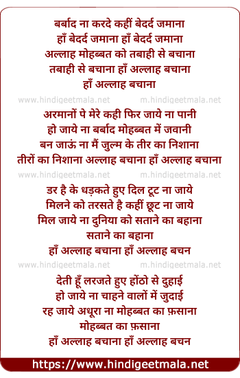 Lyrics of Barbad Na Kar De Kahi - बर्बाद ना करदे कहीं बेदर्द जमाना