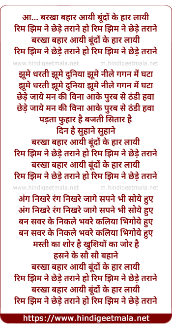Lyrics of Barkha Bahar Aayi Bundo Ke Haar Layi - बरखा बहार आयी बूंदों के हार लायी