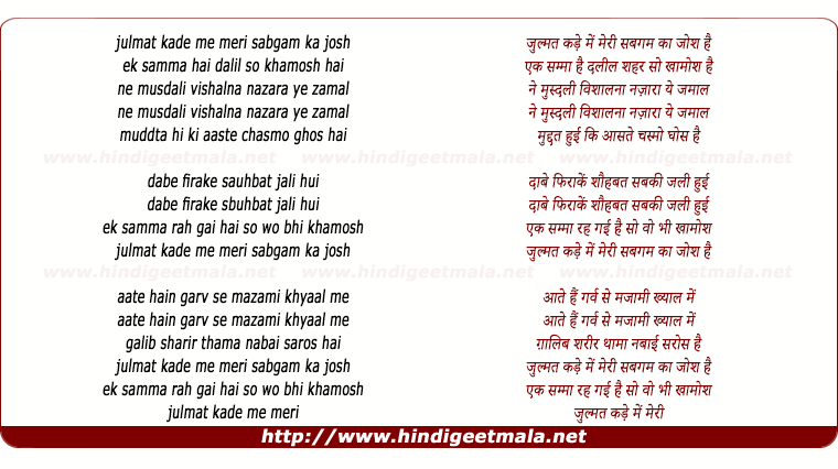 Lyrics of Barsaat Ka Haal Na Poocho, Khuda Ka Qeher Hai - जुल्मत कड़े में मेरी सबगम का जोश है