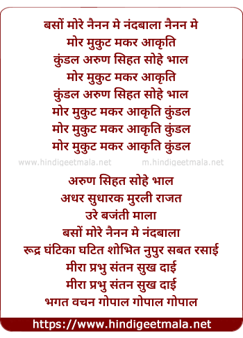Lyrics of Baso More Nainan Me Nandalala - बसों मोरे नैनन मे नंदबाला नैनन मे