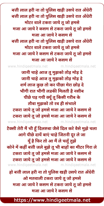 Lyrics of Batti Lal Hari Na To Polish Khadi Usape Rat Andheri - बत्ती लाल हरी ना तो पुलिस खड़ी उसपे रात अँधेरी