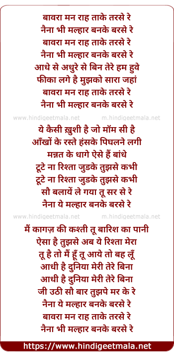 Lyrics of Bawara Mann - बावरा मन राह ताके तरसे रे