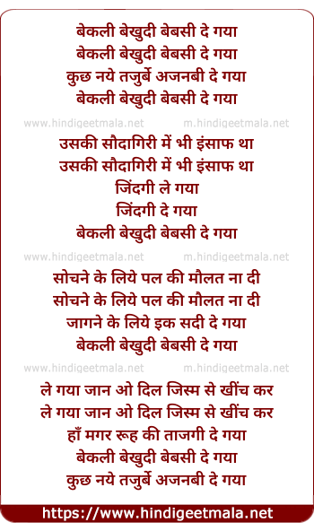 Lyrics of Be Kali Bekhudi Bebasi De Gaya (Male) - बेकली बेखुदी बेबसी दे गया