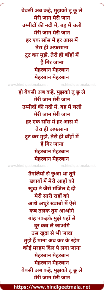 Lyrics of Bebsi Ab Kahe Mujhko Tu Chhu Le ( Meherbaan) - बेबसी अब कहे, मुझको तू छू ले