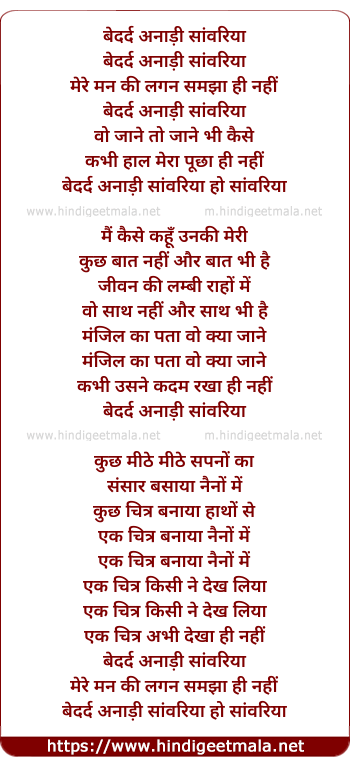 Lyrics of Bedard Anadhi Sanwariya Mere Man Ki Lagan - बेदर्द अनाड़ी सांवरिया मेरे मन की लगन