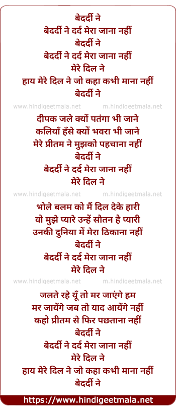 Lyrics of Bedardi Ne Dard Mera Jaana Nahi - बेदर्दी ने दर्द मेरा जाना नहीं