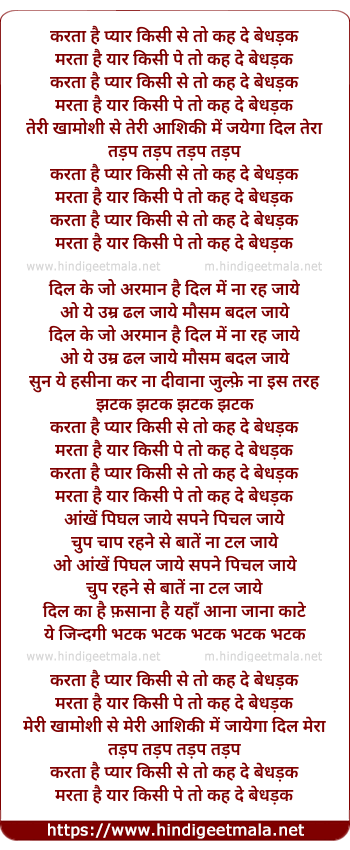 Lyrics of Bedhadak, Karta Hai Pyar Kisi Se - बेधड़क, करता है प्यार किसी से