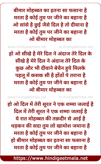Lyrics of Bimar-E-Mohabbat Ka Itna Sa Fasana Hai - बीमार-ए-मोहब्बत का इतना सा फसाना है