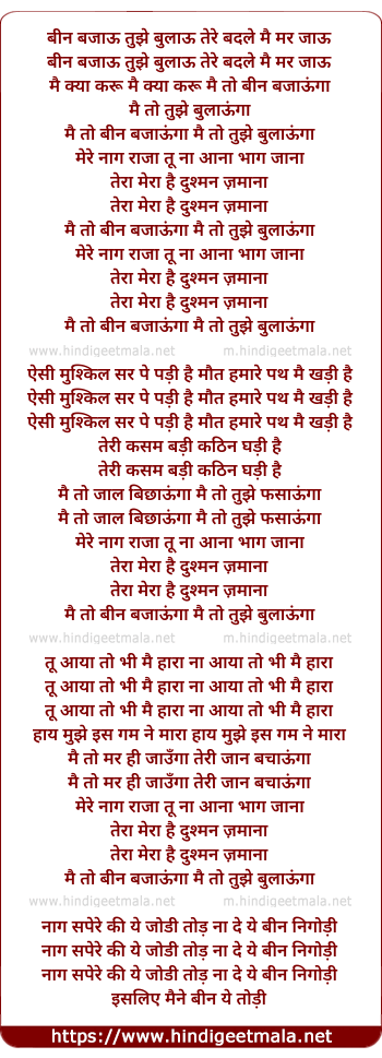 Lyrics of Been Bajaun Tujhe Bulaun (2 Part) - बीन बजाऊ तुझे बुलाऊ तेरे बदले मै मर जाऊ