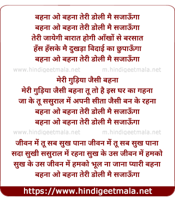 Lyrics of Behna O Behna Teri Doli - बहना ओ बहना तेरी डोली