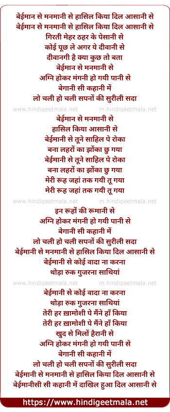 Lyrics of Beimani Si - बेईमान सी