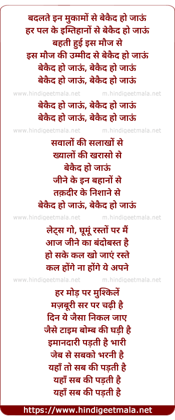 Lyrics of Bekaid Ho Jaau - बदलते इन मुकामों से बेकैद हो जाऊं