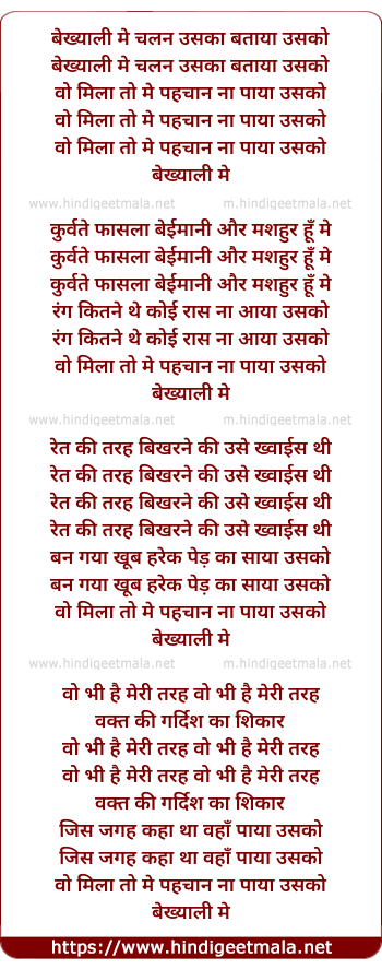 Lyrics of Bekhayali Me - बेख्याली मे चलन उसका बताया उसको