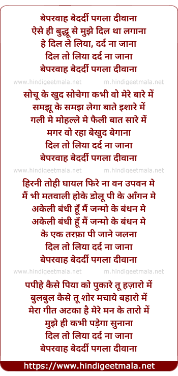 Lyrics of Beparwah Bedardi Pagla Deewana - बेपरवाह बेदर्दी पगला दीवाना