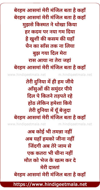 Lyrics of Bereham Aasman Meri Manzil Bata (2) - बेरहम आसमां मेरी मंजिल बता है कहाँ