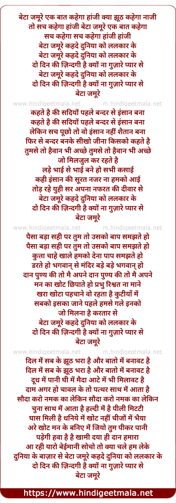 Lyrics of Beta Jamure Keh De Duniya Ko Lalkar Ke, Do Din Ki Zindagi Hai - बेटा जमूरे कह दे दुनिया को ललकार के, दो दिन की ज़िन्दगी है