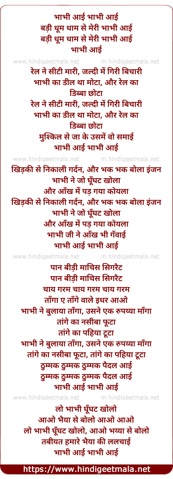 Lyrics of Bhaabhi Aai, Badi Dhum Dhaam Se - भाभी आई, बड़ी धूम धाम से