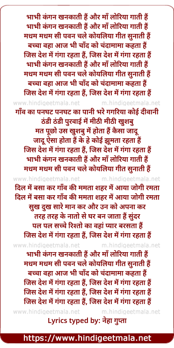 Lyrics of Bhaabhi Kangan, Jis Desh Men Gangaa Rahataa Hai - भाभी कंगन, जिस देश में गंगा रहता है