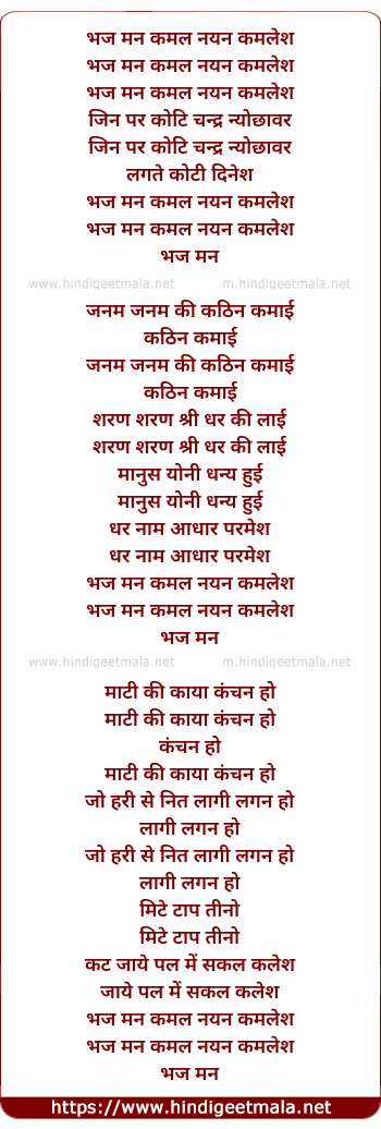 Lyrics of Bhaj Man Kamal Nayan Kamlesh - भज मन कमल नयन कमलेश