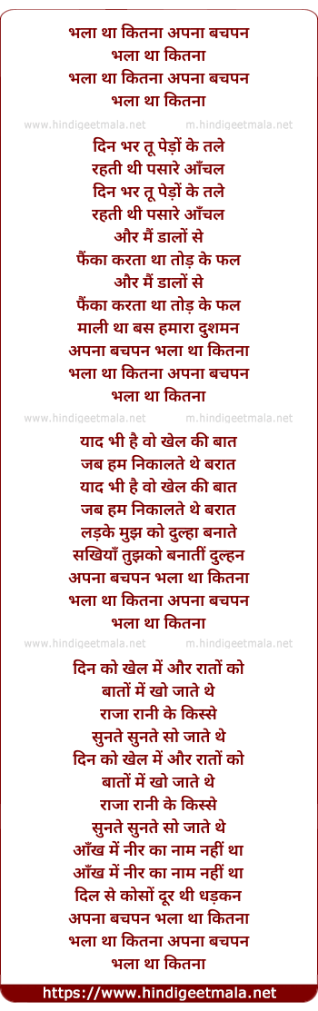 Lyrics of Bhalaa Thaa Kitnaa Apanaa Bachapan - भला था कितना अपना बचपन