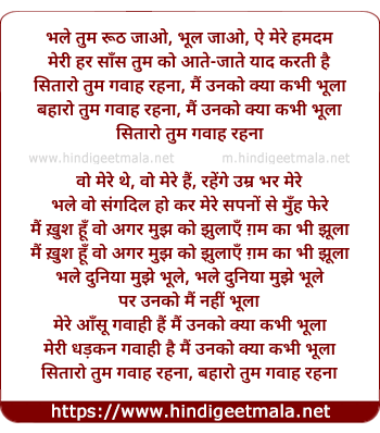 Lyrics of Bhale Tum Ruth Jaao, Sitaaro Tum Gavaah Rahanaa - भले तुम रूठ जाओ, भूल जाओ, ऐ मेरे हमदम