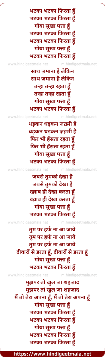 Lyrics of Bhatakaa Bhatakaa Phirataa Hun - भटका भटका फिरता हूँ