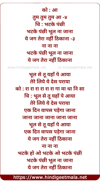 Lyrics of Bhatake Panchhi Bhul Naa Jaanaa - भटके पंछी भूल ना जाना