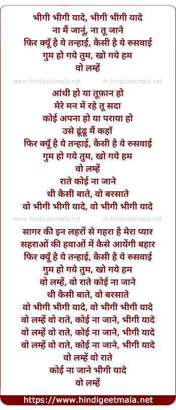 Lyrics of Bhigi Bheegi Yaade - भीगी भीगी यादे, भीगी भीगी यादे
