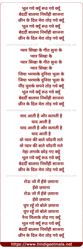 Lyrics of Bhool Gaye Kyo Rooth Gaye Kyu - भूल गये क्यूँ रूठ गये क्यूँ