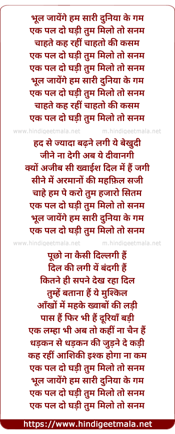 Lyrics of Bhool Jayenge Hum Sari Duniya Ke Gam - भूल जायेंगे हम सारी दुनिया के गम