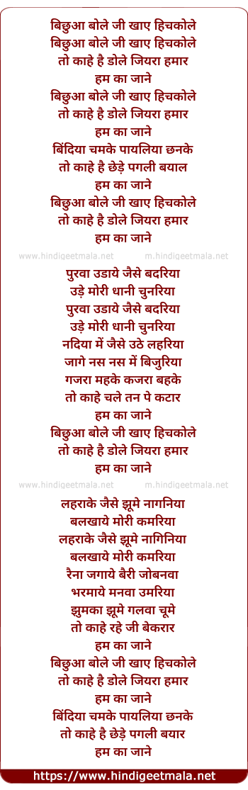 Lyrics of Bichhua Bole Je Khaye Hichkole - बिछुआ बोले जी खाए हिचकोले