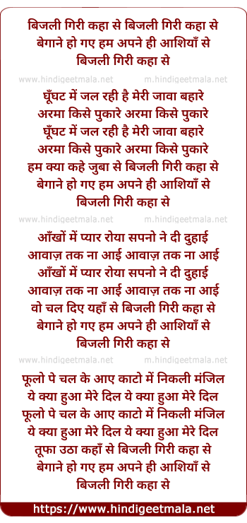 Lyrics of Bijli Giri Kahan Se Begane Ho Gaye Hum - बिजली गिरी कहाँ से बेगाने हो गये हम