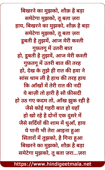 Lyrics of Bikharne Ka Mujhko Shauq Hai Bada - बिखरने का मुझको शौक है बड़ा